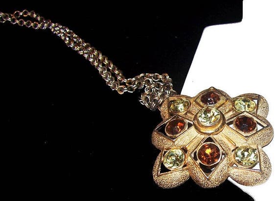 Beautiful Sarah Coventry Pendant Chain Necklace. The chain is 24" long with double curb chains. Pendant is 2 1/2" both ways in a hexagon shape, geometric design. Stones are topaz, amber, and peridot green. Nice large rhinestones. Brushed gold metal complete the look. Very nice piece, dates to the 1960s-70s. Signed piece. Very good condition. Thanks for looking and buy with confidence, i've been selling online for over 18 years, and love vintage anything. Get this to add to your vintage collection, or to wear now. Have fun and Enjoy!